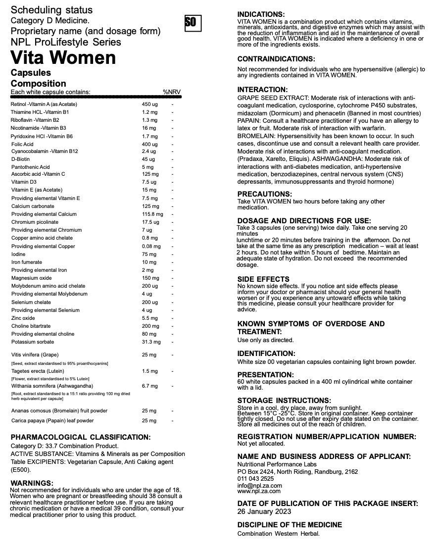 NPL’s Vita Women is a full spectrum multivitamin and mineral complex for overall health and wellness. Vita Women contains herbal extracts to support immune health, metabolism, stress, and cortisol management. Vita Women includes antioxidants and mineral support for healthy hair, skin, and nails as well as support for digestion, daily energy, and vitality. Vita Women is a convenient all-in-one daily supplement, designed for women with active lifestyles.