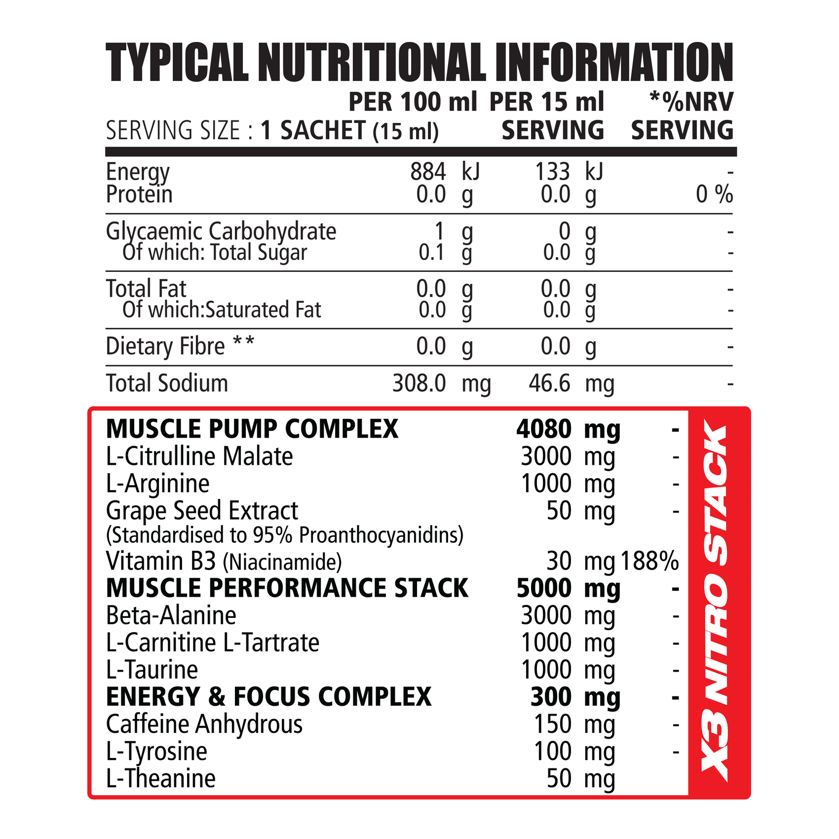 NPL’s Nitro Rush is an ultra-concentrated pre-workout liquid, allowing for rapid delivery of the key active ingredients to boost nitric oxide production. Nitric Oxide is a key signalling molecule that acts as a potent vasodilator, which allows for increased blood flow to the working muscle during intense exercise and ultimately greater muscle pumps and exercise performance.
