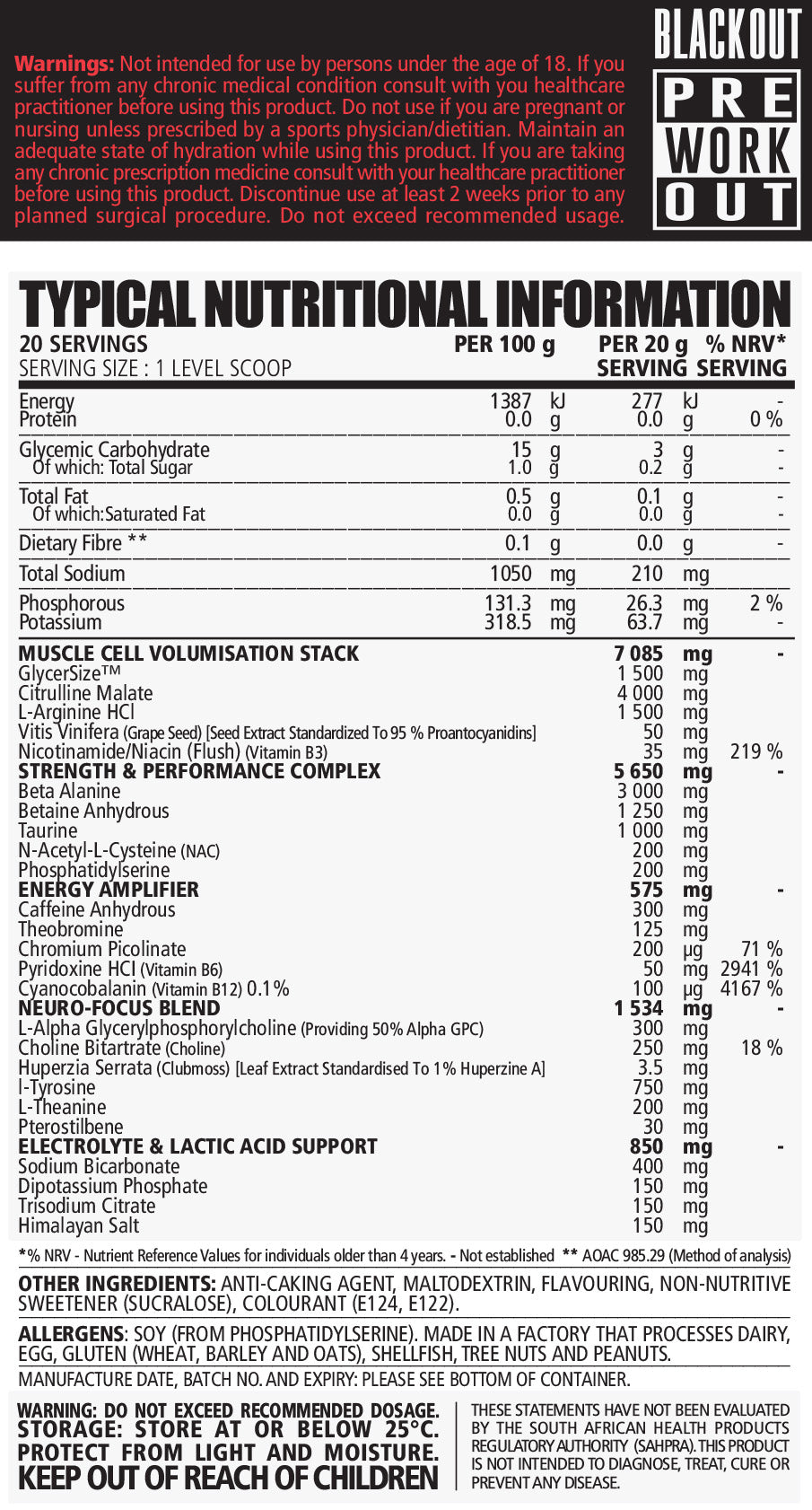 Blackout joins NPL’s arsenal of innovative pre-workouts, precisely formulated to elevate exercise performance, enhance muscle cell volume, and provide sustained energy to get you through even the most physically demanding workout. Blackout contains key ingredients that target critical training components including cell-volumisation, strength and performance, energy amplification, focus and alertness, and electrolyte support. Blackout is unrivaled when it comes to promoting training intensity, allowing you to take your training to the next level.